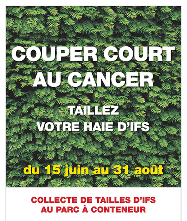 A partir du 15 juin, rapportez vos tailles d’ifs dans les parcs à conteneurs : vous contribuerez ainsi de façon concrète à la lutte contre le cancer ! Les jeunes rameaux de votre haie d'ifs contiennent de la baccatine, une substance utilisée dans la fabrication de médicaments anticancéreux.